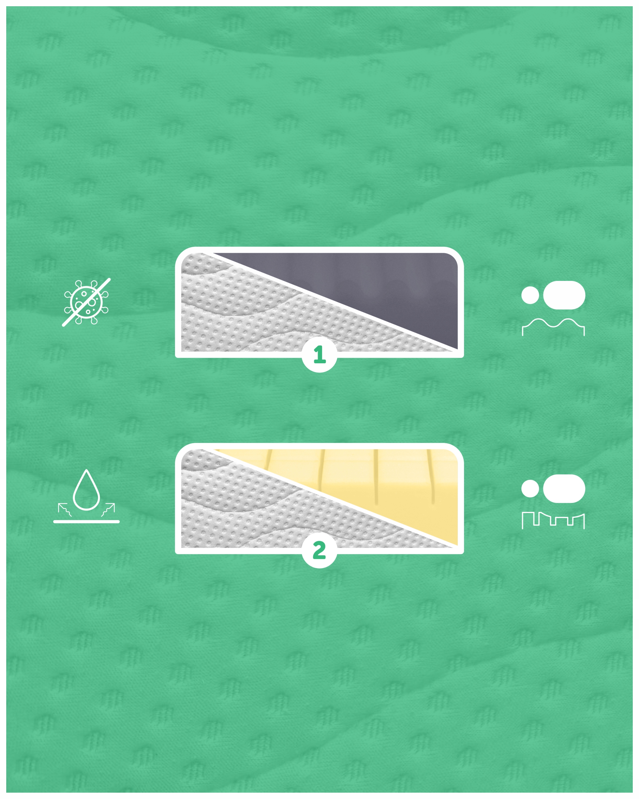 2️⃣ Profilowana powierzchnia z panelami piankowymi – fale i przetłoczenia wspierają cyrkulację powietrza, pomagając utrzymać suchy i przyjemny mikroklimat podczas snu.