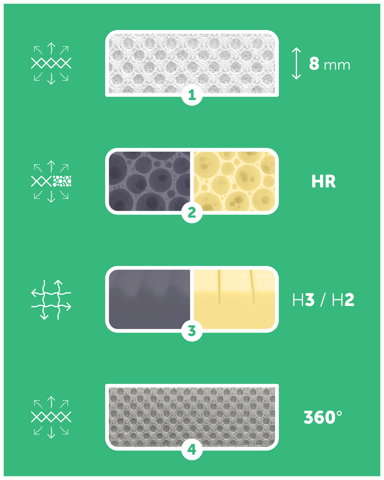 2️⃣ Pianka HR40 – stabilna i sprężysta, wspiera konstrukcję materaca i umożliwia odprowadzanie wilgoci przez warstwy pokrowca.