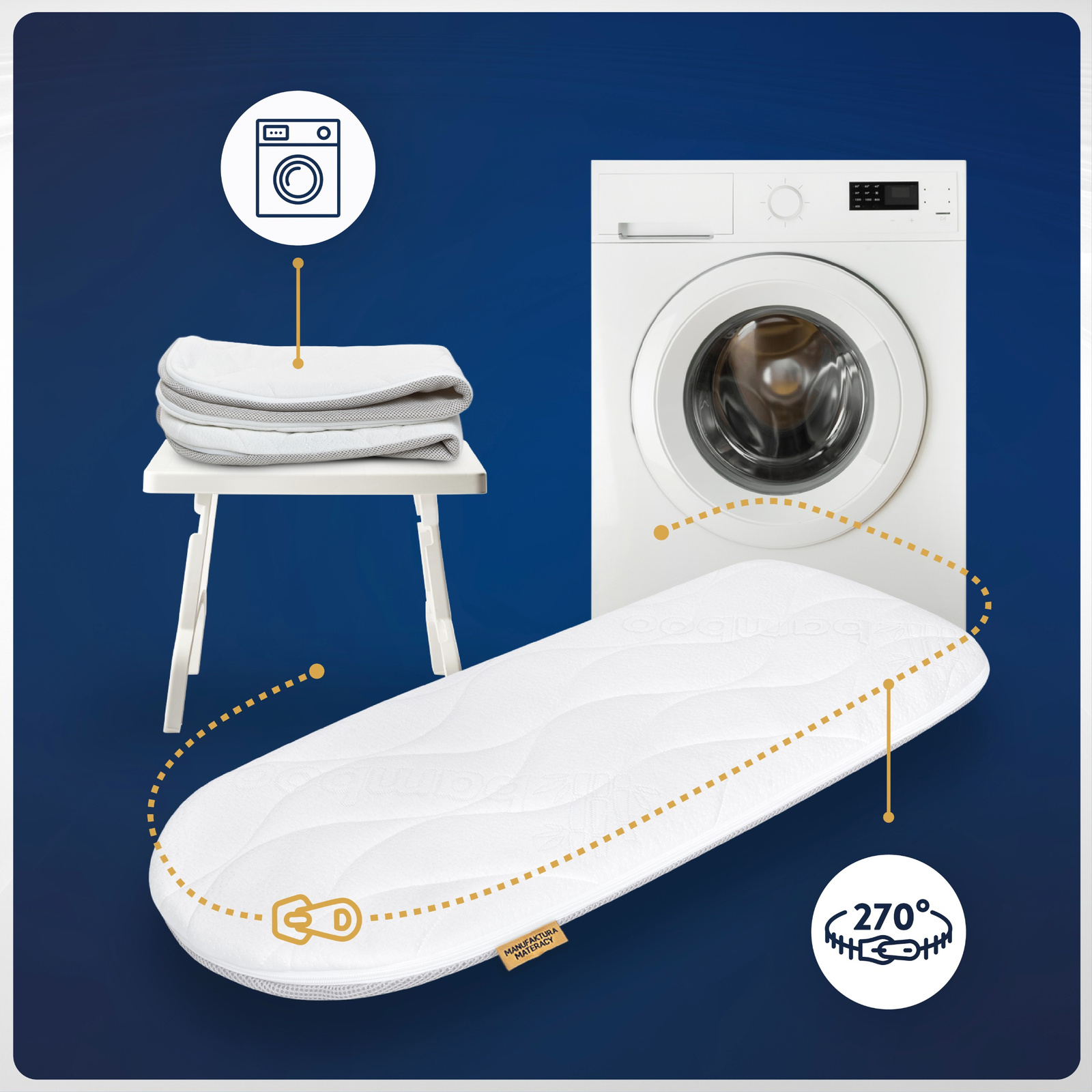1. System wentylacji w materacu Lepsza higiena snu i wyjątkowy komfort cieplny Twojego maluszka dzięki połączeniu poziomych kanałów wentylacyjnych i siatki oddychającej w pokrowcu. 2. Dwustronność pokrowca Dostosuj stronę pokrowca w zależności od aktualnej pory roku – oddychająca strona sprawdzi się latem, cieplejsza strona zimą. 3. Możliwość prania pokrowca Możliwość wielokrotnego prania w temperaturze do 40°C, co pozwala zadbać o higienę i świeżość przy codziennym użytkowaniu.