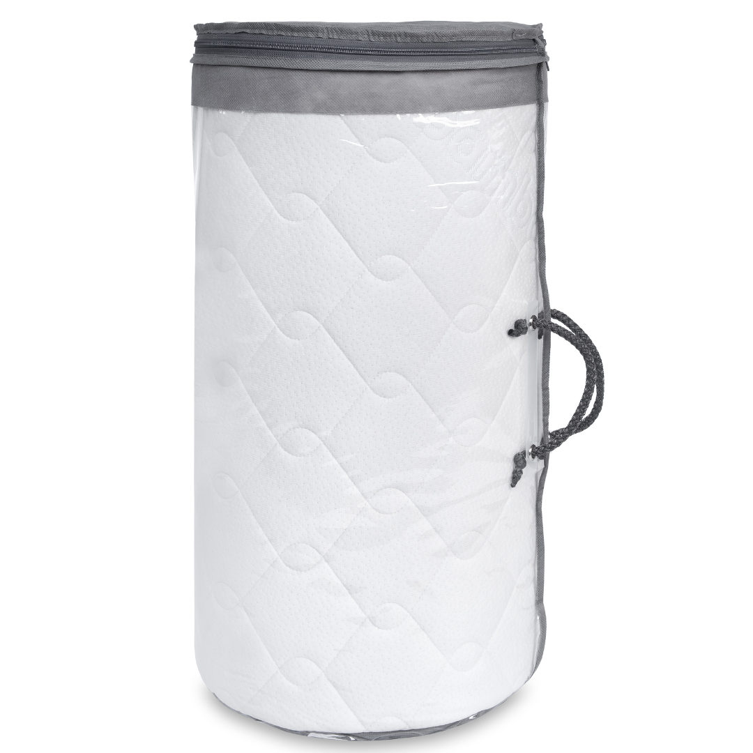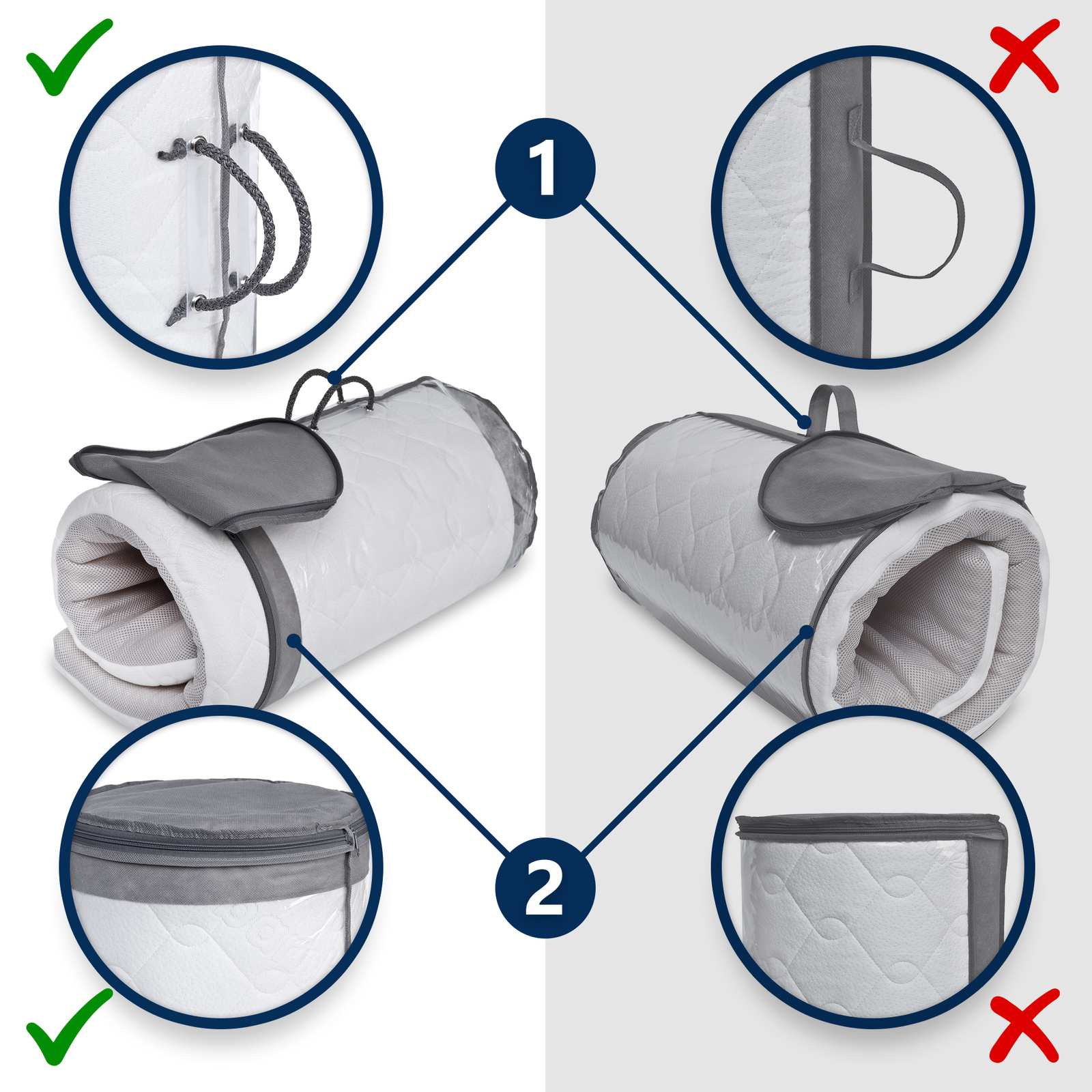 Profil fali wycięty w piance ułatwia zwinięcie materacyka w rulon na czas podróży. Wygodne opakowanie w kształcie tuby z rączką zapewnia mobilność i higienę produktu.