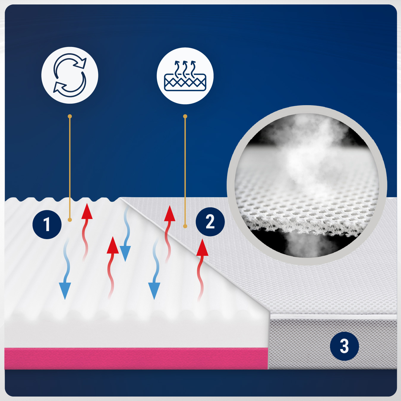 3️⃣ Siateczce wentylującej 3D na bokach – współpracuje z kanalikami wentylacyjnymi materaca, odprowadzając zgromadzoną wilgoć.