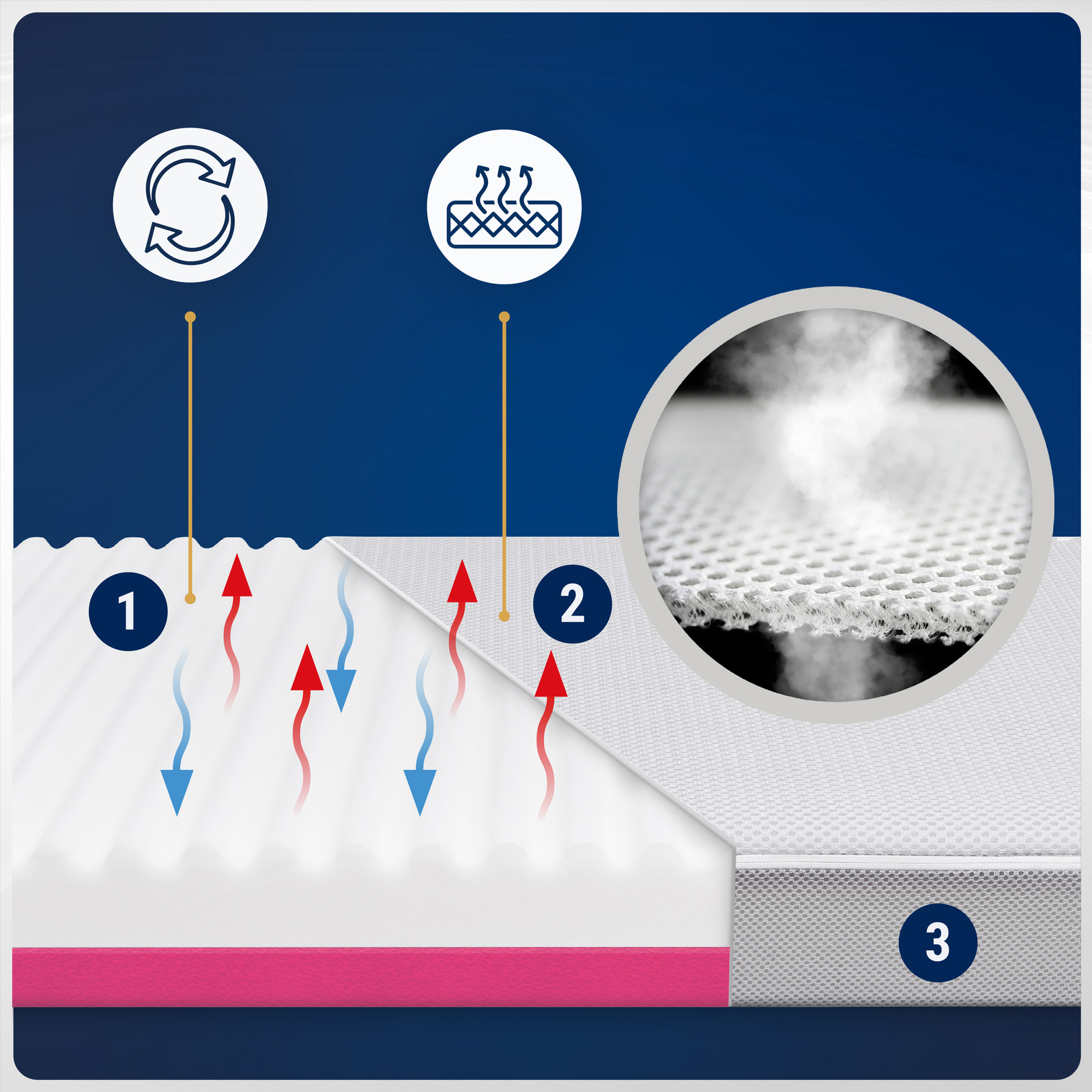 3️⃣ Siateczce wentylującej 3D na bokach – współpracuje z kanalikami wentylacyjnymi materaca, odprowadzając zgromadzoną wilgoć.
