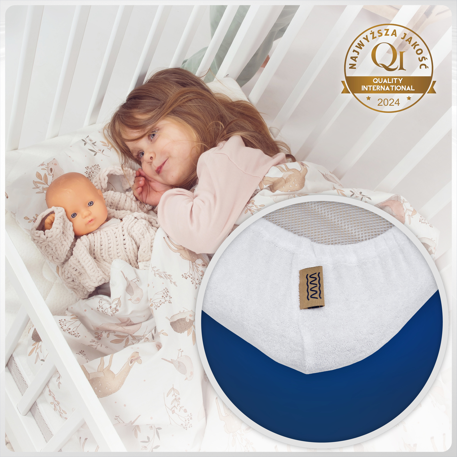 3️⃣ Oddychająca dzianina bawełniana – nie zaburza wentylacji materaca, wspiera cyrkulację powietrza i pozwala skórze dziecka swobodnie oddychać przez całą noc.